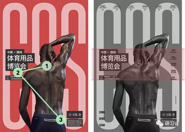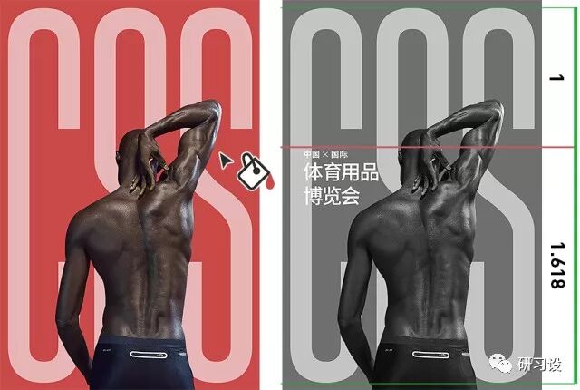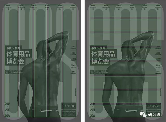 体育用品的范围过于广泛,在没有哪种用品能够具有代表性的时候,我们可以选择表现“体育运动”这一概念的意向图片作为版面中的主体元素。添加展览名称的首字母缩写作为辅助版面的图形信息并大致确定好应用的比例与位置。