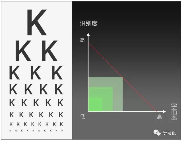 我们的视觉中枢在辨认信息的时候,会优先看到视觉面积大的元素,而文字的面积越小,我们看到的画面就会越模糊。左图我试着用我们测试视力的“视力表”来说明这个问题,也就是说字面率越高的文字通常识别度也就更高。
