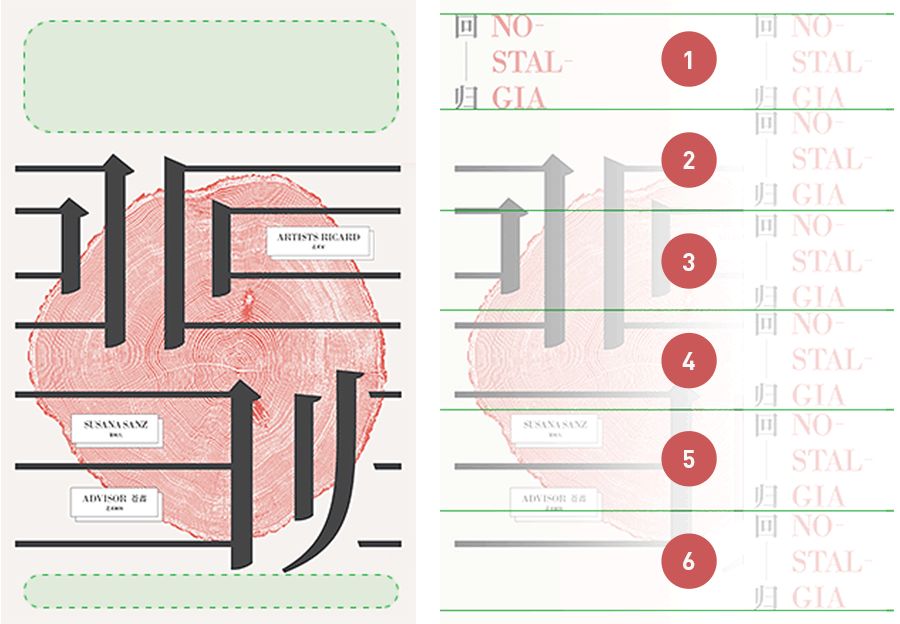 为了展现“回归”这一概念,将象征时间轴的图形首尾相接,来表现其从回源头回归过去的视觉印象。回归二字的笔画结构神似书籍画卷,在加上宋体精致的笔画轮廓,除烘托过去的美好之外也为版面添加了几分雅致氛围。