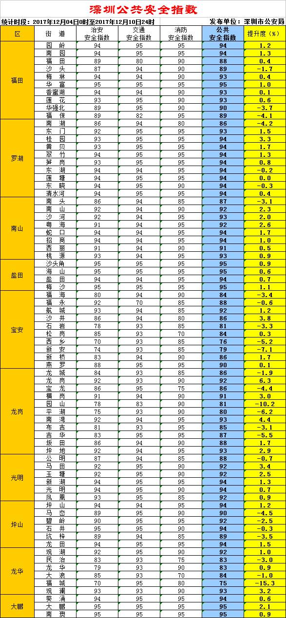 我局围绕市委市政府“城市管理治理年”工作部署要求,借鉴国内其他城市的成功做法,于2016年4月5日开始,每周通过《深圳特区报》、《深圳新闻网》、市公安局门户网站、公安微信、微博,向社会发布一次深圳公共安全指数,保障市民群众知情权、监督权,引导社会各界广泛参与 “平安深圳”建设。