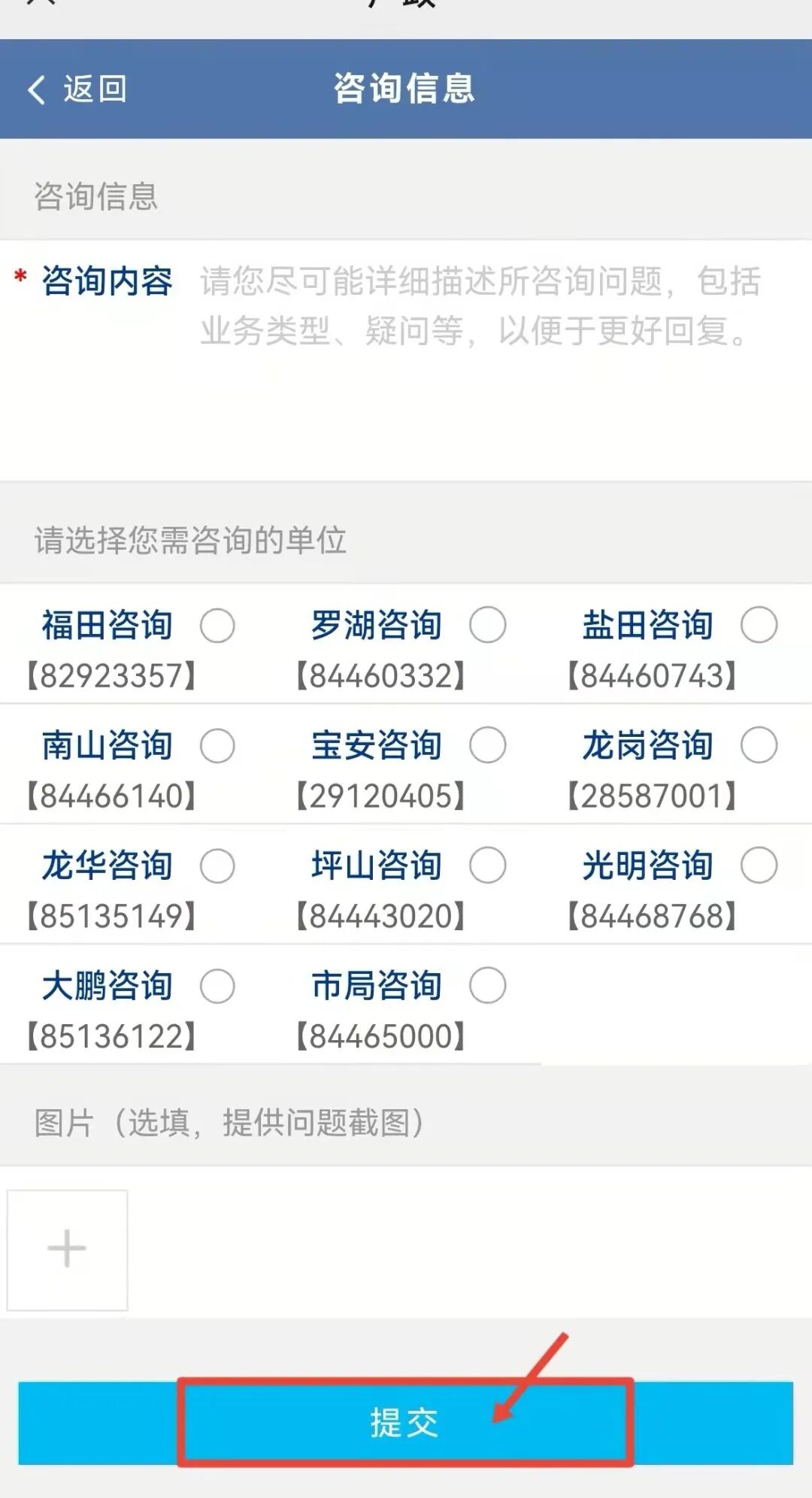 填写需要咨询的问题,选择咨询单位,可上传问题图片,核对无误后进行提交,24小时内即可得到答复。