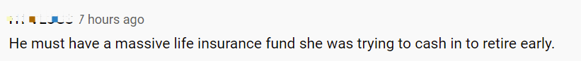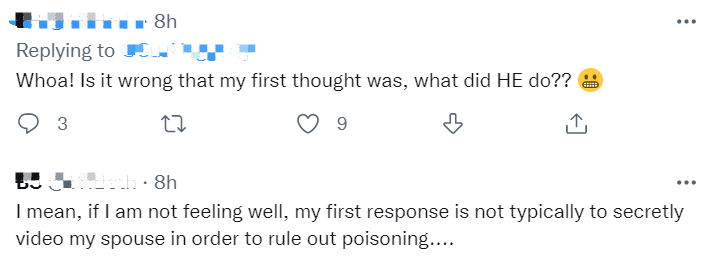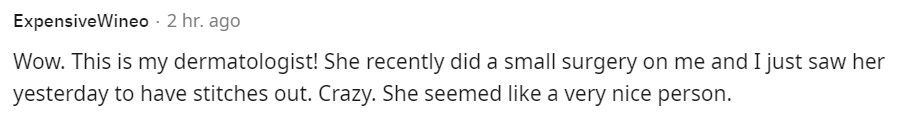 这是我的皮肤科医生! 她前不久刚给我做了一个小手术,我昨天刚见过她,要把缝线取出来。疯了。她看起来是个非常好的人。如果我感觉不舒服,我的第一反应,肯定不会是为了排除中毒的可能性,而秘密地给我的妻子录像。我们想知道她用什么下毒的,说不定其他人也有同样的症状虽然我的收入不错,但在我和前妻分居时,她比我多赚4万美元。她也是一位收入丰厚的医学专家。她吓坏了,因为她认为她不得不支付我的赡养费。 我有一种感觉,这个case也是这种情况。我敢打赌,他正在谈论离婚,而她不希望向他支付赡养费。可能他有一大笔巨额保险金,她正试图兑现,这样她就能早点退休了幸好这个人正在康复,否则他的遗言就是:你.....你....