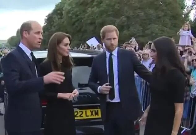 “梅根的肢体语言暗示,她可能感到格格不入,不知道该把自己放在哪里,哈里王子轻轻地站在她身后,抚摸她的手臂,以一种保护性和令人放心的方式表示支持。四人的另一次同框,是在威斯敏斯特教堂内悼念女王,梅根哈里又被批评不分场合秀恩爱,举止不恰当。