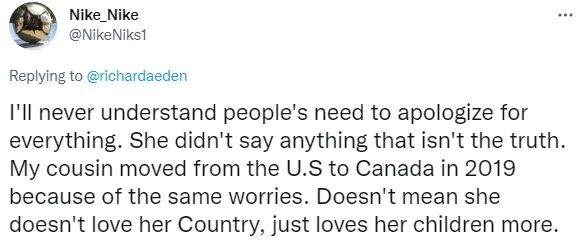 但评论里有很多网友非常支持她,认为她无需道歉,只是讲了实话而已啊。我永远不会理解人们为什么需要为每件事道歉。她没有说任何不是事实的话。出于同样的担忧,我堂兄于 2019 年从美国搬到了加拿大。不代表她不爱她的国家,只是更爱她的孩子。