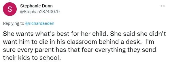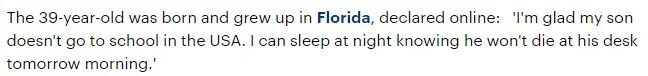 她在网上写道:“我很高兴我的儿子没有在美国上学。我知道他明天早上不会死在课桌前,所以我晚上可以入睡了。”![]()