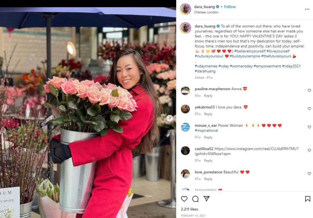 跟前男友“被分手”后,英国广大媒体也一直为黄达拉抱不平,很多家媒体甚至直接表明不看好公主的这段婚姻。但对于黄达拉本人来说,种种迹象标明,姑娘早已翻篇啊!去年情人节,黄达拉在ins上po了抱着一大束玫瑰花的照片,给所有女生写下了诚意满满的一段话:“我想对所有爱过自己的女人说,无论别人让你感觉如何,你永远都只属于自己。情人节快乐!关注自己、时间、独立和积极,就能构建属于你自己的帝国。”![]()
