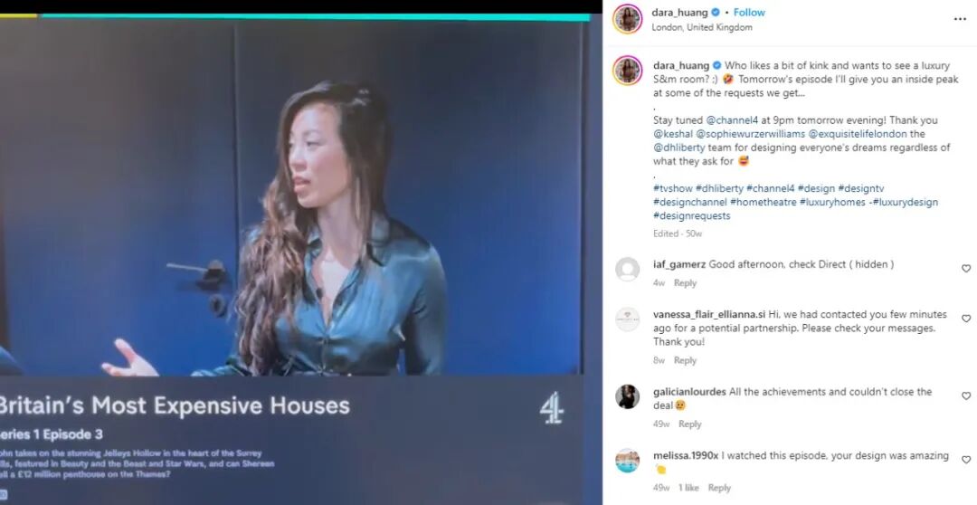 图片来自Ins @dara_huang,版权属于原作者在这样的家庭背景下,黄达拉也一路优秀到大。她先是就读于佛罗里达大学,并于 2004 年毕业,获得设计文学学士学位,后又在哈佛大学获得建筑学硕士学位。毕业后,她如愿成了一名建筑师,翻看她的设计履历,含金量颇高。她曾在瑞士的 Herzog & de Meuron 建筑事务所和伦敦的 Foster and Partners 建筑事务所工作。在这些公司,她参与了几个大型项目,包括纽约市伦纳德街 56 号摩天大楼、伦敦泰特现代美术馆和世界各地的 Manolo Blahnik 商店的设计。2013 年,她在伦敦创立了建筑设计公司 Design Haus Liberty。 其作品曾在伦敦萨默塞特宫和威尼斯建筑双年展展出。![]()