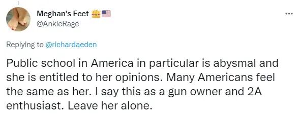 美国的公立学校尤其糟糕,她有权发表自己的意见。许多美国人和她有同感。我是以枪支拥有者和 2A 爱好者的身份这么说的,放过她。