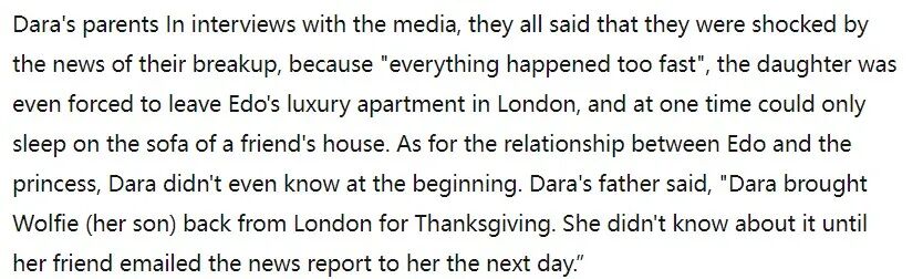 黄达拉的父母在接受采访时曾透露,大家都对分手的消息感到震惊,因为“一切都发生得太快了”,“女儿甚至被迫离开了Mozzi 在伦敦的豪华公寓,一度只能睡在朋友家的沙发上。”而至于Mozzi 和公主之间的关系,达拉一开始根本不知道。达拉的父亲说:“达拉感恩节把儿子从伦敦带回来,直到第二天她的朋友通过电子邮件将新闻报道发给她,她才知道这件事。”![]()