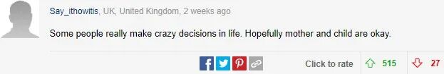 “有些人真的会在生活中做出疯狂的决定。希望妈妈和孩子都没事。”