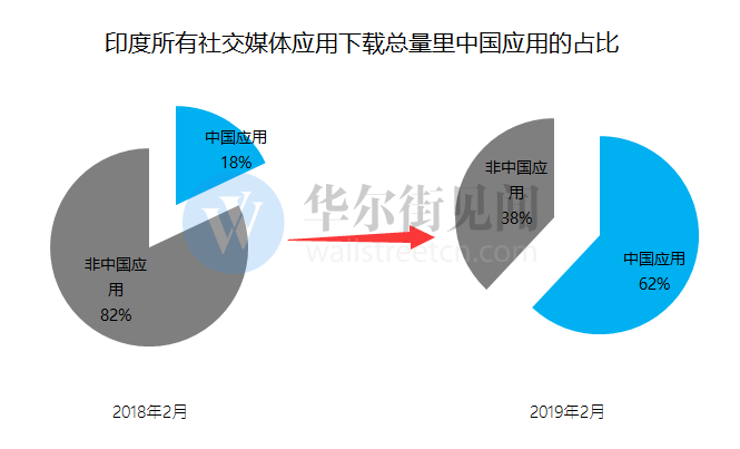 此外,在过去一年中,中国社交媒体APP的下载量占比在印度迅猛攀升。