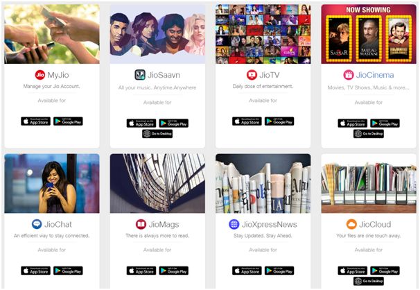 有用户自己的账号管理APP MyJio,音乐下载和播放APP JioSaavn,可以收看电视剧集的JioTV,收看电影的JioCinema,即时通讯软件JioChat,用来阅读杂志、报纸以及浏览新闻的JioMags、JionNewsPaper、JioXpressNews,提供云服务的JioCloud,提供支付服务的JioMoney等等。