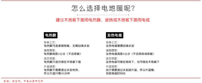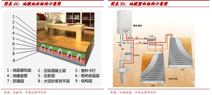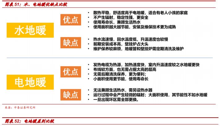 地暖分类:根据热媒介质的不同,地暖被分为水地暖和电地暖。水地暖 以温度不高于 60℃的热水为热媒,在管内循环流动加热地板,通过地面 以辐射和对流的传热方式向上供暖;电地暖则是将低温发热电缆作为热 源进行传热,利用温控器调节温度。电地暖又可分为电热膜和发热电缆。