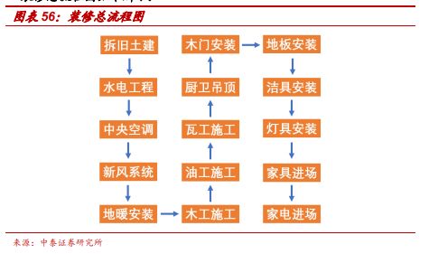装修流程由六个步骤组成,分别是(1)拆旧土建;(2)水电施工;(3) 土建施工;(4)安装工程;(5)家具家电进场;(6)新风系统、中央空调和地暖。
