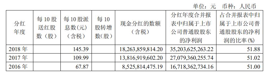 据公司年报,2018年度拟10派145.39元,合计182.6亿元用于分红,占当年归母净利润的51.88%,公司近三年均以超过一半净利润的额度用来分红。