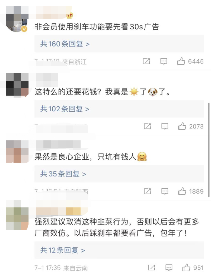 大家表示:“这叫订阅不叫解锁,后轮转向解锁都要付费,刹车包月怎么样”、“这是商家割韭菜”等等。