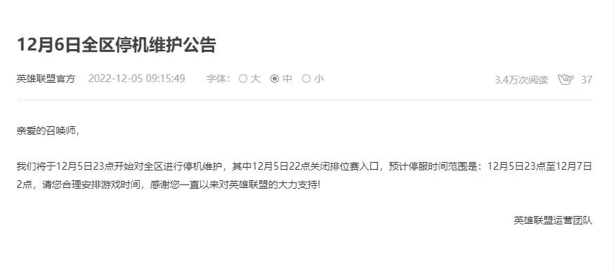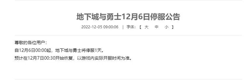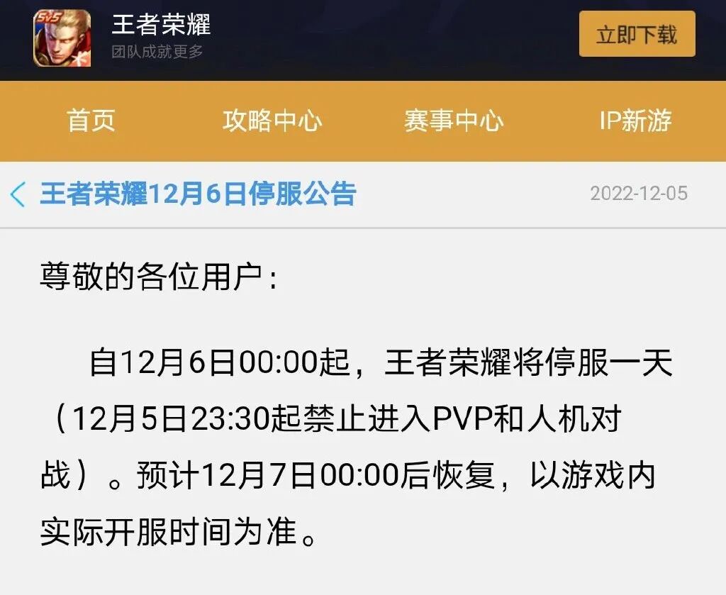 其中,王者运营团队公告,自12月6日00:00起,王者荣耀将停服一天,预计12月7日00:00后恢复,以游戏内实际开服时间为准。