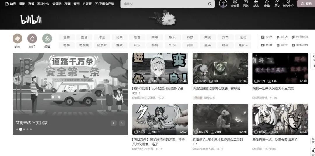 爱奇艺,腾讯视频,优酷视频、b站长视频平台,则是首页整体加了黑白滤镜,变成了黑白色。