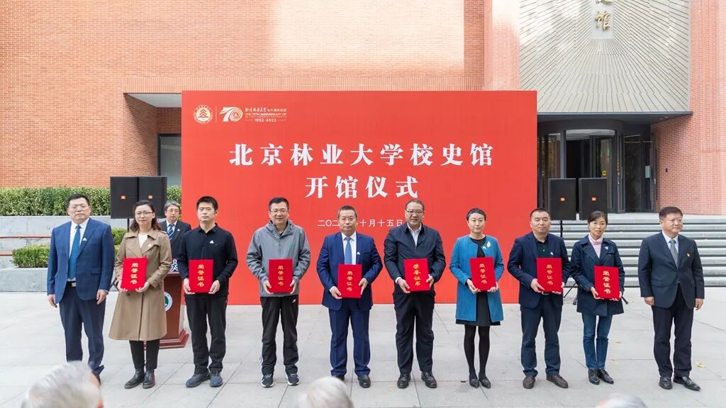 仪式上,王洪元、安黎哲共同为梁希先生亲属吴宝兰、朱之悌亲属林惠斌、王斌瑞亲属成凤仙、孟兆祯亲属孟凡、陈俊愉亲属陈瑞丹等向校史馆捐赠实物的个人代表、单位代表颁发捐赠证书。