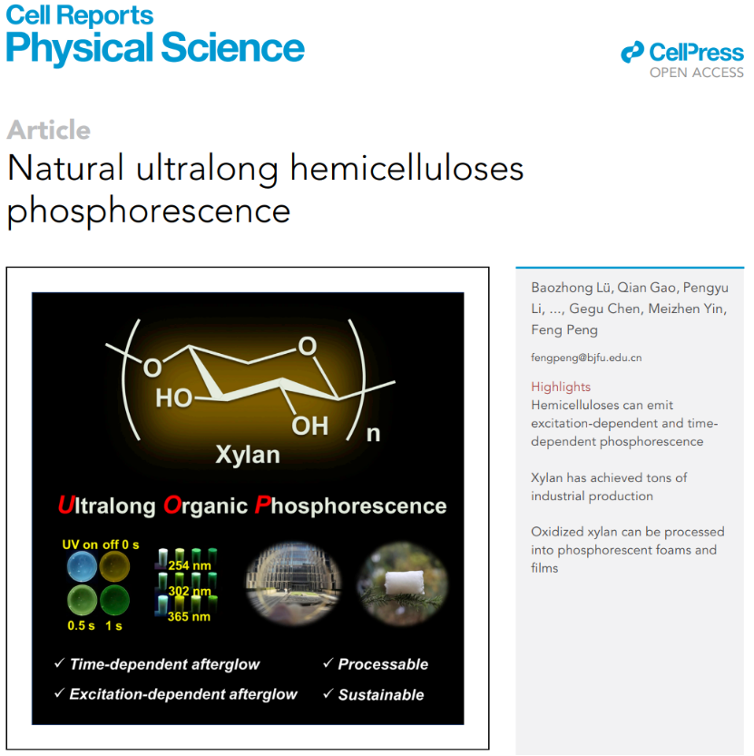 近期,北京林业大学材料科学与技术学院彭锋教授团队率先发现了经浓碱提取的高结晶性聚木糖类半纤维素的室温磷光现象,相关成果在Cell Press出版集团旗下综合期刊《Cell Reports Physical Science》在线发表,引起了领域内的高度关注。日前,《Nature》杂志将该成果遴选为Research Highlights(研究亮点),以“Paper-mill waste that glows in the dark”为题进行了报道,并从制浆造纸副产物再利用的角度充分肯定了该研究工作的价值与意义。Nature研究亮点文章每年遴选300-400项工作,主要描述发表在本刊或其他期刊的科学和技术全领域研究进展,关注主要研究结果,强调其显著的意义,并对该研究主题提供进一步的讨论。
