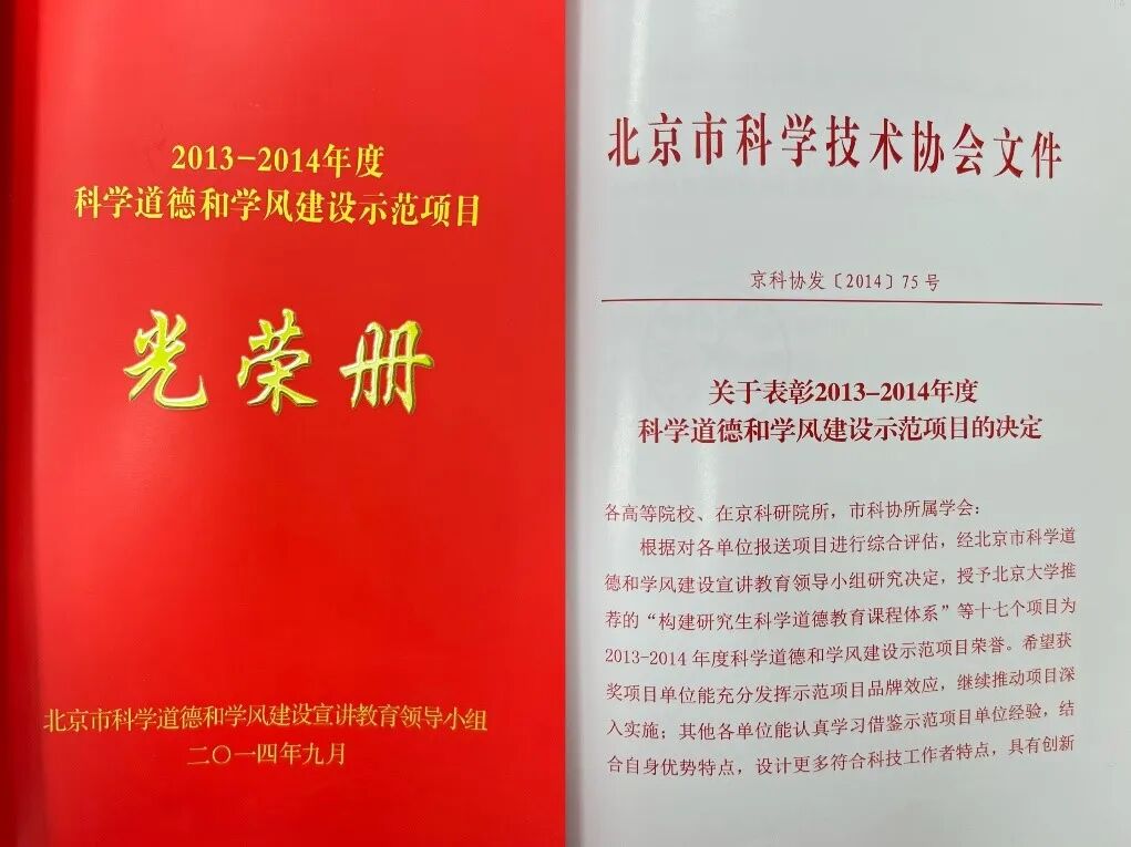 2014年9月,北京市科学道德和学风建设宣讲教育领导小组授予北京林业大学研究生新生“科学道德培育工程”项目为2013—2014年度科学道德和学风建设示范项目荣誉。
