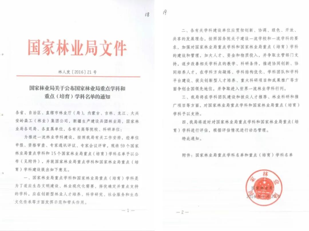 2016年2月23日,国家林业局重点学科和重点(培育)学科名单公布。北京林业大学林学、林业工程、风景园林学、生物学、生态学、农林经济管理列为国家林业局重点学科。北京林业大学科学技术哲学(生态文明建设与管理方向)、地图学与地理信息系统、国际贸易学(林产品贸易方向)被列为国家林业局重点(培育)学科。