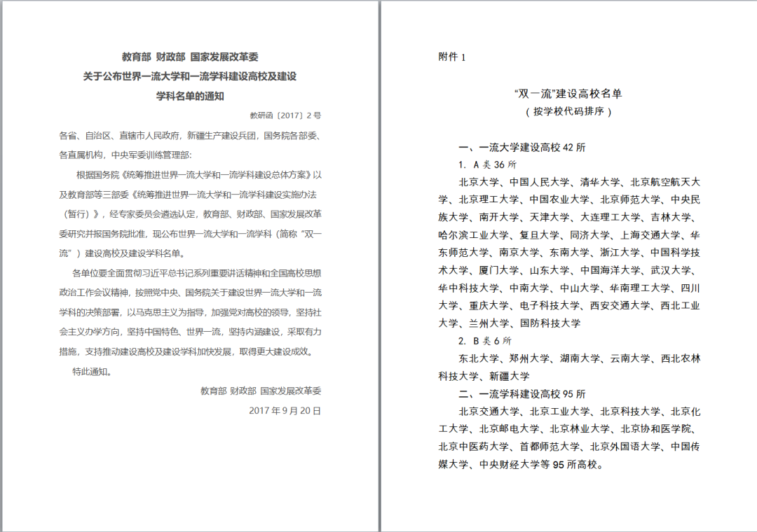 教育部、财政部、国家发展改革委《关于公布世界一流大学和一流学科建设高校及建设学科名单的通知》