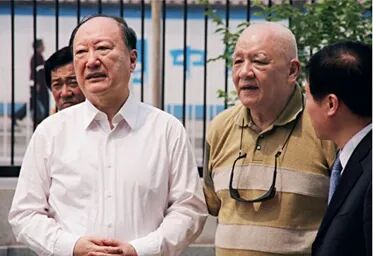孟兆祯(右二)向时任中国工程院院长徐匡迪(左一)介绍中国工程院综合办公楼园林绿化环境设计工程