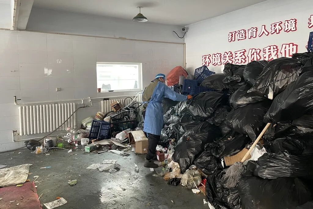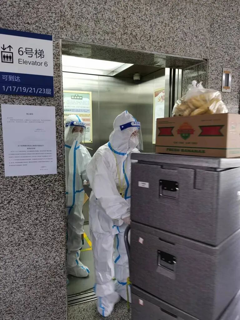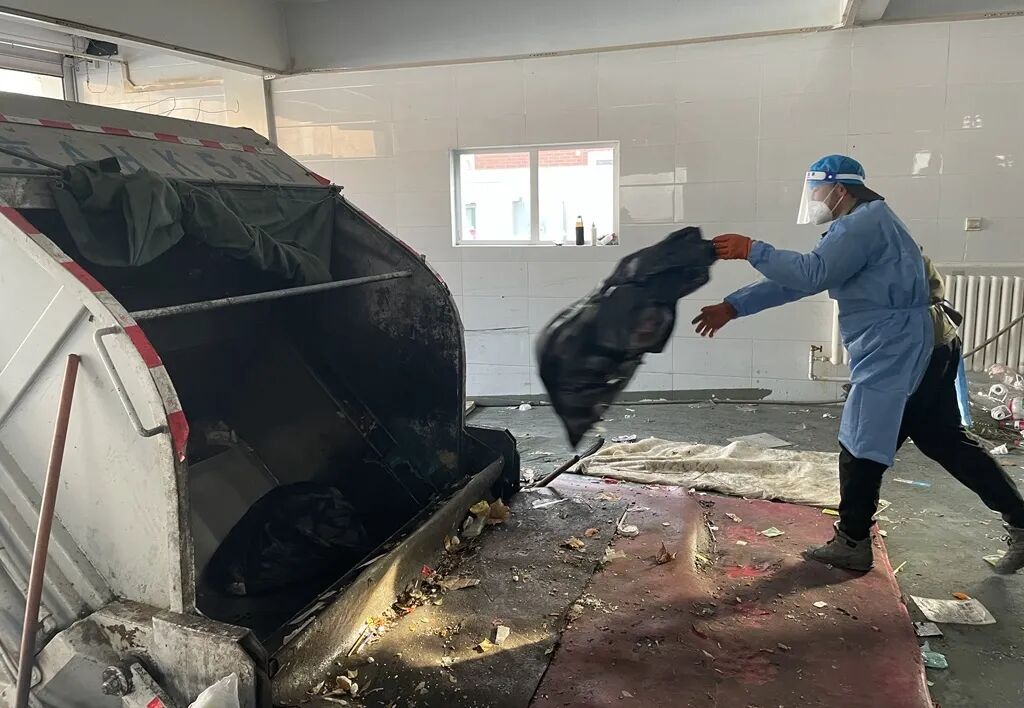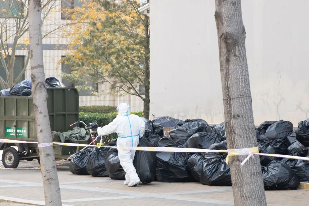 被管控楼宇的保洁消杀任务尤其艰巨,每天消杀面积达70000多平米,每名保洁人员每天需要对4个楼层进行至少4遍的卫生清洁和消杀;每天要完成楼内600多袋约6吨的垃圾转运,不让垃圾过夜; 他们每天5点就开始忙碌,一直到晚上12点,夜间还要做好应急值守,保证24小时响应。