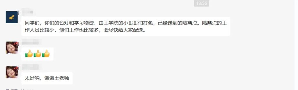 “住的条件怎么样,还缺什么?”“屋子里暖和吗?”“物资已送达”“北林就是你们最坚实的保障!”一条条来自学院教师和学工干部关切的消息发送到隔离师生的手机上。