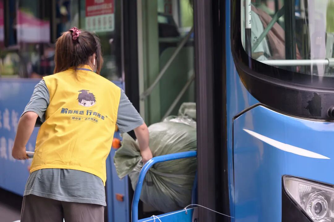 踏着小车运送行李、提供解暑饮品的后勤人员