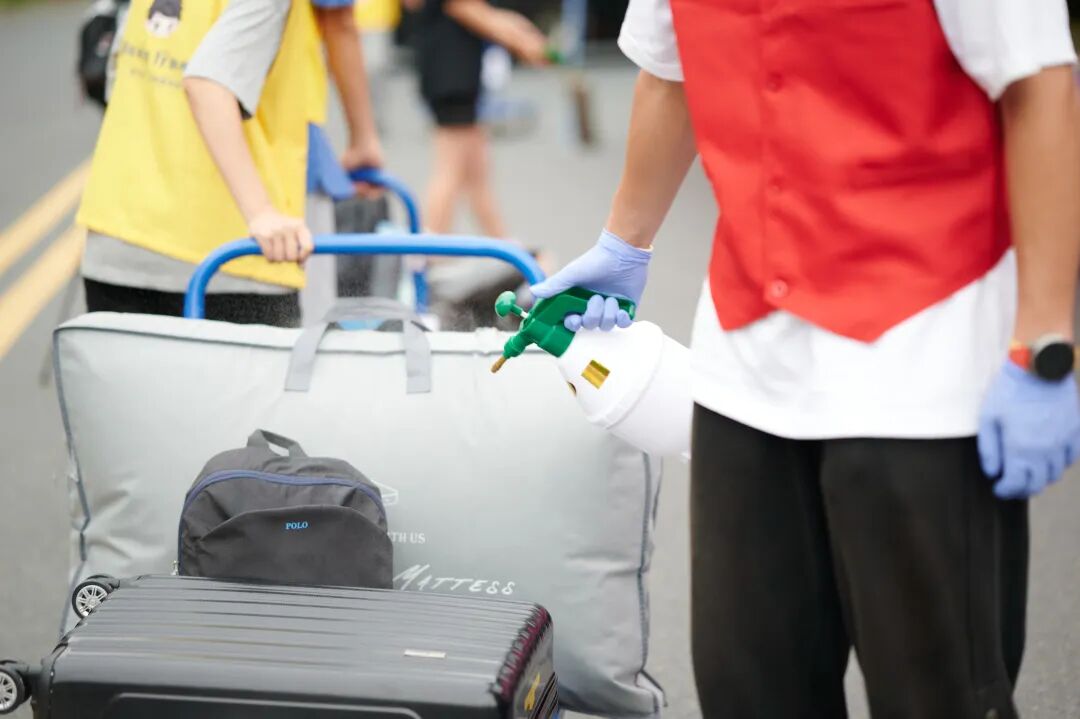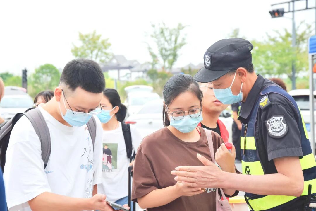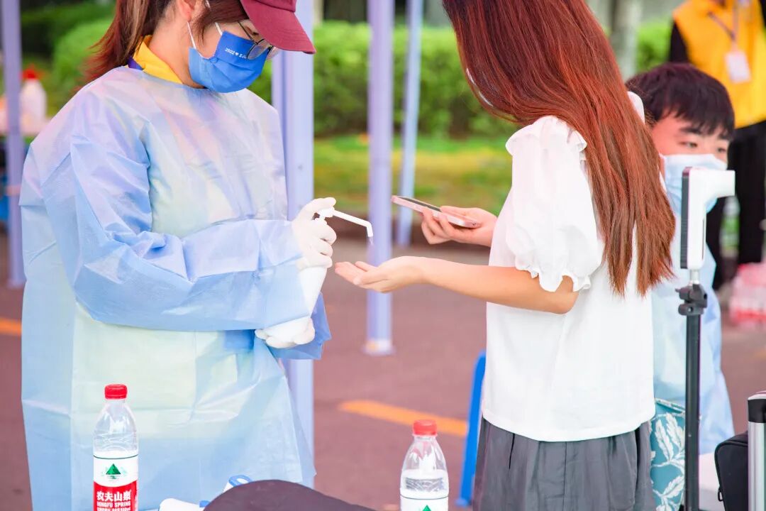 校门口认真测温消毒的工作人员