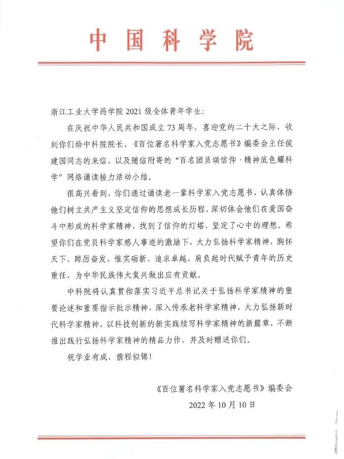 初心不改,薪火不息。习近平总书记曾指出“科技创新,贵在接力”,通过诵读老一辈的入党志愿书,我们秉持了初心,坚定了信仰,品味着以爱国主义为底色的科学家精神,感受科学家们成为坚定的共产主义者的思路历程。以党员领航员的身份翻开回信,信中字字饱含对我们药学学子的殷切期望,作为一名中共党员以及未来科研工作的预备役,我将牢记习近平总书记在党的二十大报告中的嘱托:“时代呼唤着我们,人民期待着我们,唯有矢志不渝、笃行不怠,方能不负时代、不负人民”,赓续科学家精神,不畏挫折、敢于试错,肩负起科技创新重任,踔厉奋发,立志将自身理想信念融入党和国家的事业中。