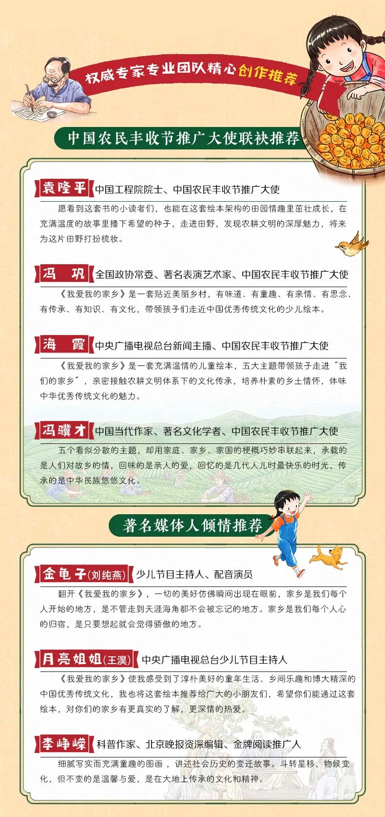 该套绘本是在中国农民丰收节组织指导委员会的支持下,由中国农业出版社策划编辑团队与国内著名童书原创品牌米莱童书联合制作,历时两年打磨而成。中国农业出版社党委书记、社长陈邦勋表示,希望这套图书唤起读者心灵深处对家乡的记忆和热爱,激发青少年对中华传统文化的兴趣和热情,让每一个人都能发自内心的去传播和传承家乡传统文化,增强中华民族的文化自信。