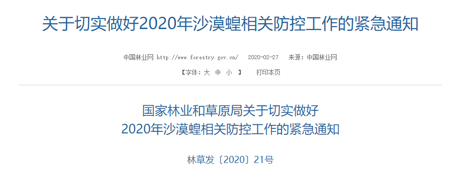 近日,我国林业和草原局发布《关于切实做好2020年沙漠蝗相关防控工作的紧急通知》。