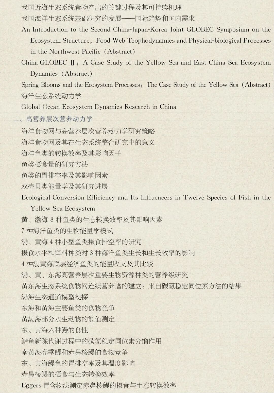 1993—2010年,主要记录了海洋生态系统研究的实施,包括海洋生态系统动力学过程及动态研究,大海洋生态系变化和适应性管理对策研究,专属经济区、大陆架和公海海洋生物资源调查评估,以及养殖容量和渔业碳汇研究等;