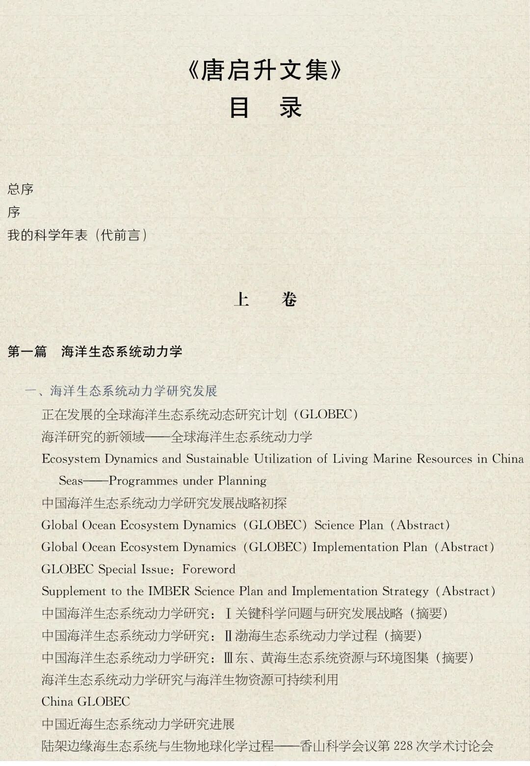 该文集分为上、下两卷。上卷为海洋生态系统研究篇,包括海洋生态系统动力学和大海洋生态系两篇,外含由唐院士亲自编著的科学年表代前言部分,这部分对唐院士科研生涯进行了年代式的实况记述和小结;下卷为渔业生物学拓展篇,包括海洋渔业生物学、碳汇渔业与养殖生态和可持续发展战略研究三篇,另外,下卷还附录了唐启升院士科研简历、论著目录、传略、访谈录以及有关照片等。这些论著及有关材料记录了近半个世纪渔业科学新的研究进展和成果。