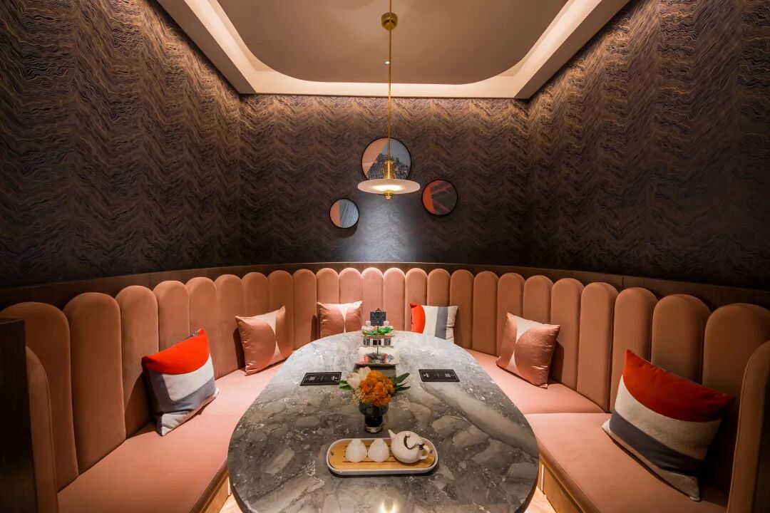 坐在造型奇特又时尚的的粉色绒面圆弧形沙发软包上