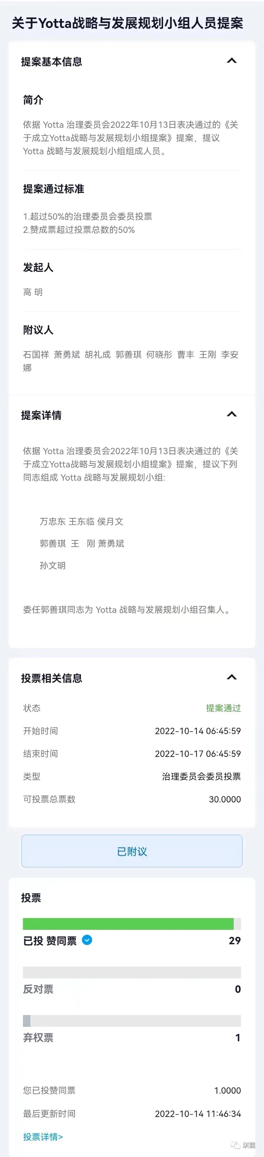 2022年10月17日上午六点四十六分,由Yotta治理委员会高明委员发起的《关于Yotta战略与发展规划小组人员提案》正式通过。