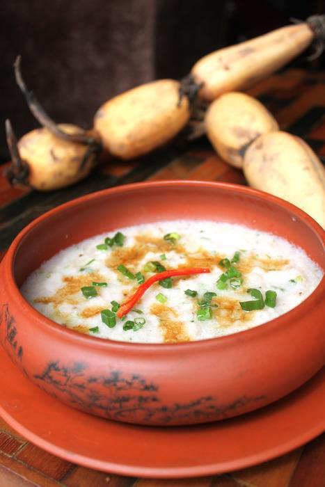做法:鲜藕150克,粳米100克,白糖适量。将藕切洗净,切粒,与粳米同放入锅中,加清水适量,煮粥。待粥熟时调入白糖,再煮沸两次即成。或将鲜藕榨汁,待粥熟时调入粥中服食。