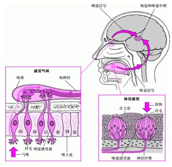 当空气中的分子进入鼻腔刺激纤毛,会引发附近的神经纤维产生神经冲动,传向起放大作用的神经细胞(嗅球),进而传向更高级的嗅觉中枢,引起嗅觉。