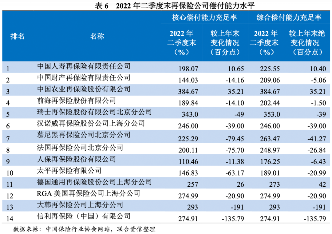 再保险行业保持较快发展态势,行业头部效应明显。与国外相比,我国再保险行业发展较晚。根据中国保险行业协会网站披露数据,截至2022年6月末,中国境内共有14家再保险公司,包括6家中资再保险公司及8家国际再保险公司的分支机构。在直保业务快速发展的背景下,国内再保险市场保持较快发展态势。2022年上半年,除个别公司保险业务收入增速为负,整体行业保险业务收入增速较好;在保险业务收入市场排名方面,中国人寿再保险有限责任公司及中国财产再保险有限责任公司保持市场排名前2位;其中中国农业再保险股份有限公司于2020年12月31日成立,注册资本161亿元,其作为政策性再保险公司主营农业险再保险业务,2022年上半年保险业务收入已居于市场第三位。