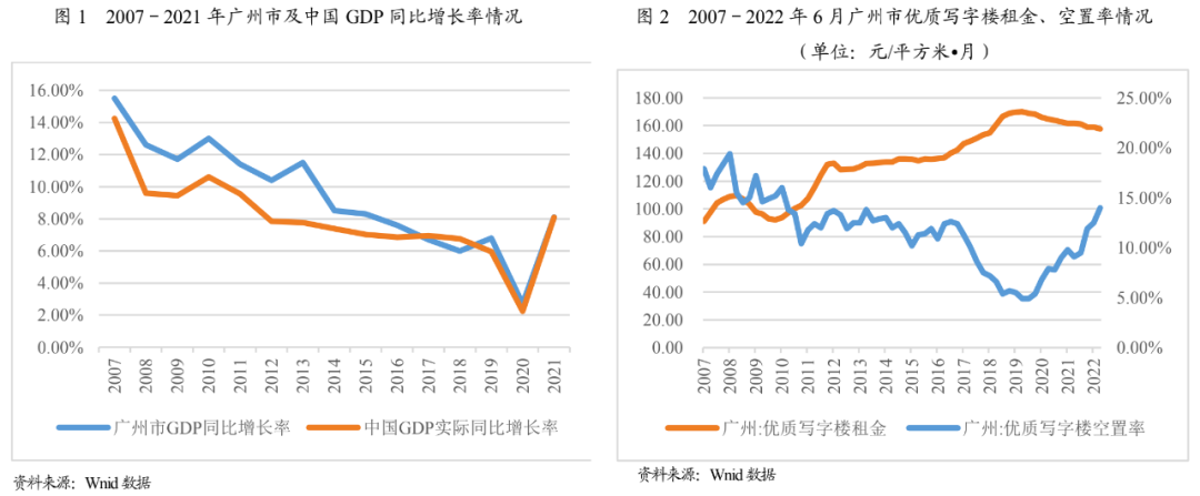 广州市作为广东省省会,是国务院批复确定的中国重要的中心城市、国际商贸中心和综合交通枢纽,同时亦是粤港澳大湾区、泛珠江三角洲经济区的中心城市以及一带一路的枢纽城市。近年来,广州市写字楼租赁市场表现良好。TMT行业和金融业为广州优质写字楼租赁市场发展的坚实基础。本文将结合宏观及区域经济环境、政策、城市规划等方面对广州市写字楼租赁市场2007-2022年6月的运营状况进行分析,并结合历史运营状况对未来写字楼租赁市场发展进行展望,进而为资产证券化项目中广州区域写字楼类标的资产价值衡量提供参考。
