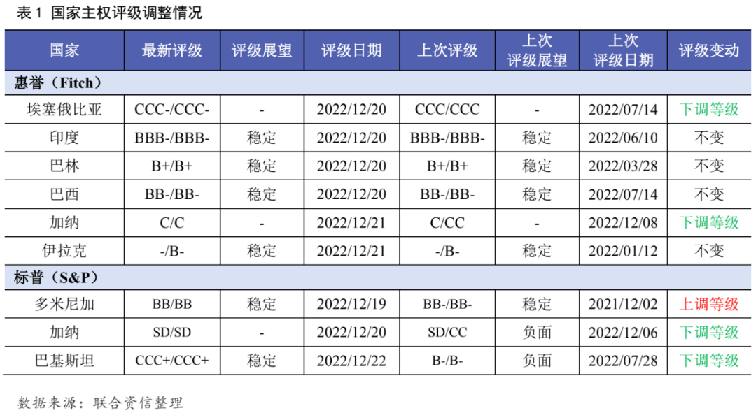 12月20日,标普维持加纳长期本币信用等级为SD不变,将加纳长期外币信用等级由CC下调至SD,同时不再对加纳进行信用展望。21日,惠誉维持加纳长期本币信用等级为C不变,同时将加纳长期外币信用等级由CC下调至C。标普认为,加纳政府于12月19日宣布暂停偿还商业外币债务和商业定期贷款,构成选择性违约。惠誉认为,加纳政府宣布暂停偿还债务是主权违约程序的开始。