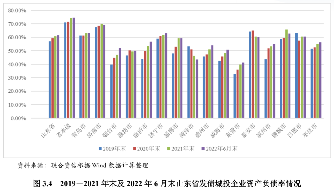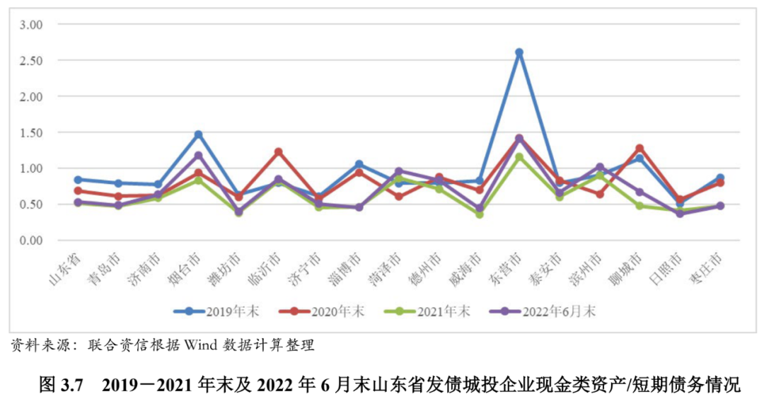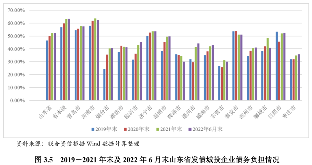 从发债城投企业债务负担看,2019-2021年末,除菏泽市、泰安市和日照市外,山东省其他地级市发债城投企业整体资产负债率和全部债务资本化比率呈上升趋势,债务负担有所加重。从山东省各地级市城投企业债务指标看,截至2022年6月末,济南市、青岛市、济宁市、泰安市和日照市的发债城投企业资产负债率均超过60%、全部债务资本化比率均超过50%,上述地级市的发债城投企业债务负担相对较重。