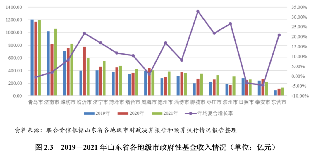总体来看,基于区位优势和产业定位,山东省各地级市以三大经济圈形式呈现,其中胶东经济圈和省会经济圈的核心城市青岛和济南经济及财政实力明显高于其他地级市,各地级市财政实力多与其经济排名相匹配。2021年,受益于经济恢复、疫情得到控制等因素,山东省各地级市GDP增速和一般预算增速均有所回升,部分地级市表现出高速正增长。土地出让情况分化较大,2022年上半年大部分地级市政府性基金收入同比大幅下滑。