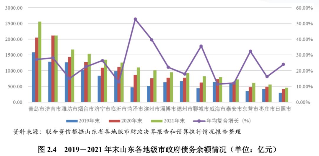 从政府债务层面看,山东省各地级市政府债务规模呈扩张趋势,2019-2021年末年均复合增长率均超过10%,其中菏泽市政府债务余额增长迅速,年均复合增长率达到52.78%,滨州市、聊城市和东营市政府债务余额年均复合增长率均超过30.00%。从增量债务余额来看,山东省各地级市增量债务多集中于新发行的专项债券,各地级市所发行的地方政府债券规模一般与其经济实力相匹配。截至2021年末,青岛市政府债务余额最大,济南市、潍坊市、烟台市、济宁市、临沂市、菏泽市和滨州市政府债务余额均超千亿,其余地级市政府债务余额处于400亿元~1000亿元不等,其中日照市最小,为460.41亿元。