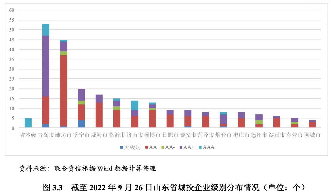 截至2022年9月26日,山东省有存续债的城投企业共246家。其中,省本级城投企业5家,地级市本级城投企业58家,地级市下辖区级及县级(含县级市)城投企业148家,园区城投企业35家;主体级别为AAA的城投企业20家,主体级别为AA+的城投企业76家,主体级别为AA的城投企业131家,主体级别为AA-的城投企业10家,无级别的城投企业9家。分地级市来看,青岛市的城投企业数量最多,为54家,其次为潍坊市(45家)、济宁市(20家)、威海市(17家)、济南市(15家)、临沂市(15家)、济南市(14家)和淄博市(13家),其余地级市城投企业数量相对较少。从级别分布看,AAA级别城投企业主要集中于省本级及经济财政实力强的青岛市和济南市,其余地级市中只有烟台市、临沂市、淄博市和潍坊市各有1家AAA级别城投企业,但上述地级市与青岛市和济南市的经济和财政实力存在一定的差距。各地级市均有AA+级别城投企业,青岛数量最多。AA级别城投企业多集中于潍坊市,AA-级别的城投企业全部位于区县和园区。
