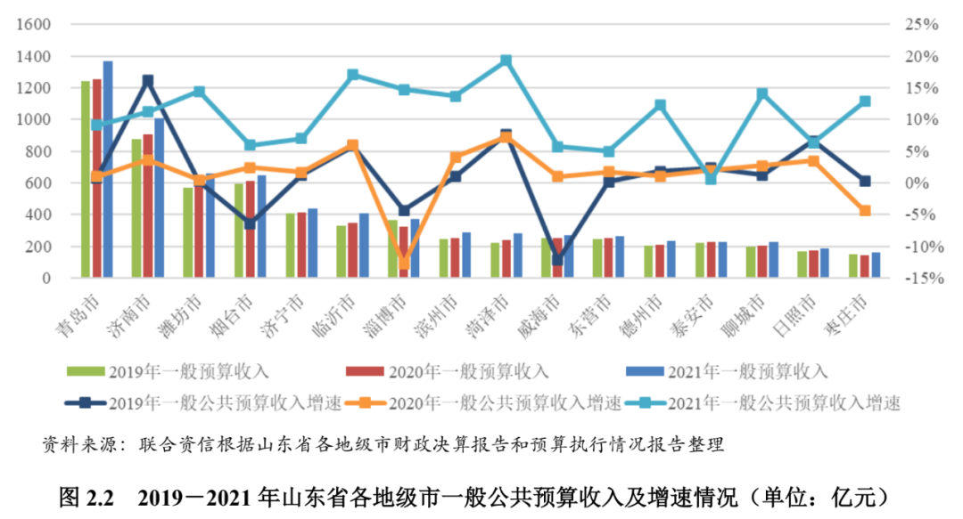 山东省各地级市的财政实力分化较为明显,胶东经济圈和省会经济圈的核心城市财政实力明显强于其他地级市。2021年,山东省大部分地级市一般公共预算收入快速增长,财政自给能力有所增强。2022年上半年,受疫情反复、减税降费及上年同期基数较高影响,山东省各地级市一般公共预算收入增速同比有所回落,政府性基金收入同比明显下降。山东省各地级市政府债务余额均呈上升趋势。