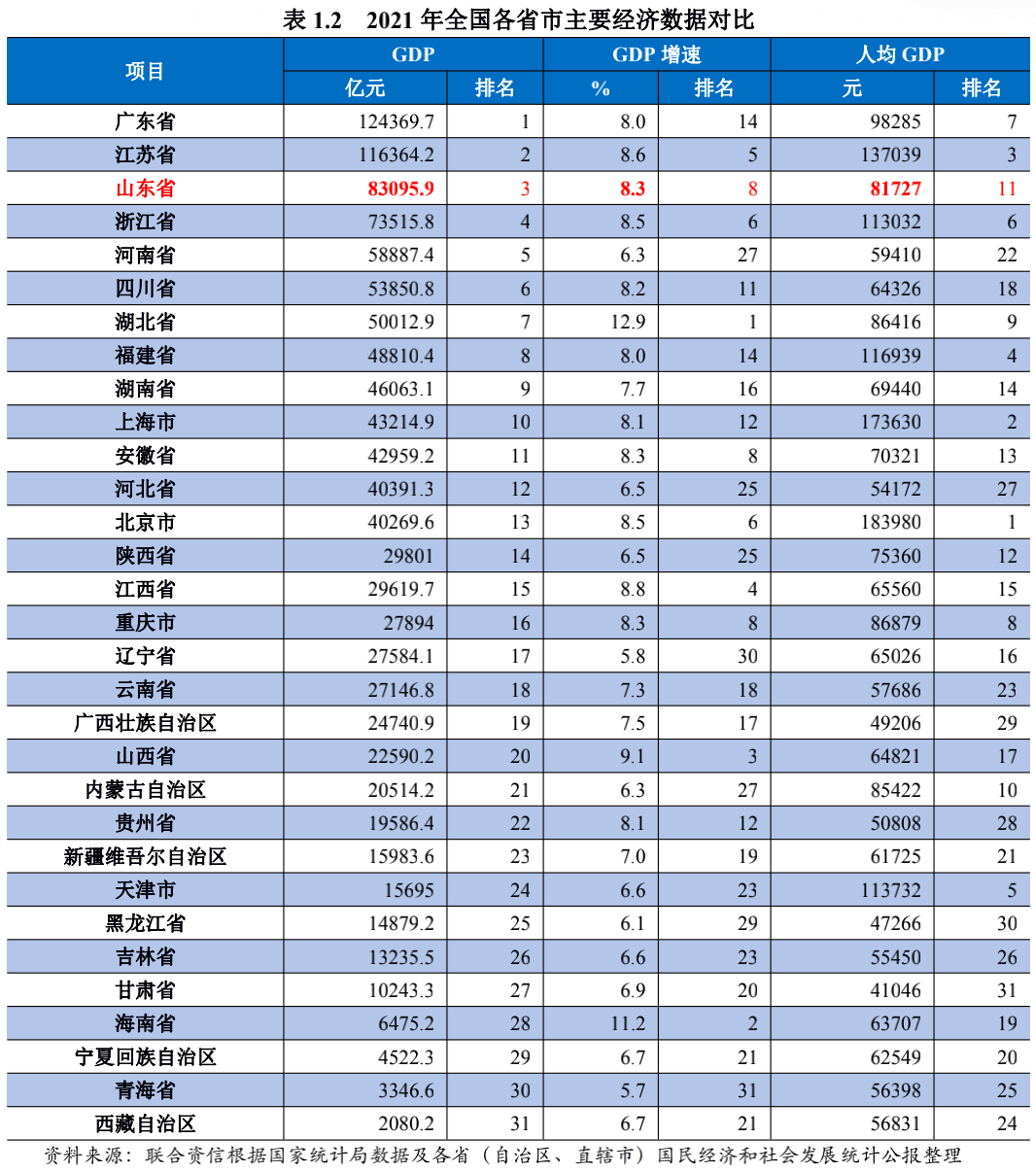 山东省地处我国胶东半岛,北邻渤海、东临黄海,黄河横贯东西,省内陆域面积15.58万平方公里,海洋面积15.96万平方公里,其所辖内陆部分自北而南与河北、河南、安徽、江苏4省接壤,可承接京津冀及长三角经济辐射,区位条件良好,是我国重要的农业、工业和人口大省。根据《2021年山东省国民经济和社会发展统计公报》,2021年末,山东省常住人口10169.99万人,常住人口较上年末增长量为5万人,增量逐渐下降,人口自然增长率0.02‰,总人口数仅次于广东省,居全国第2位。